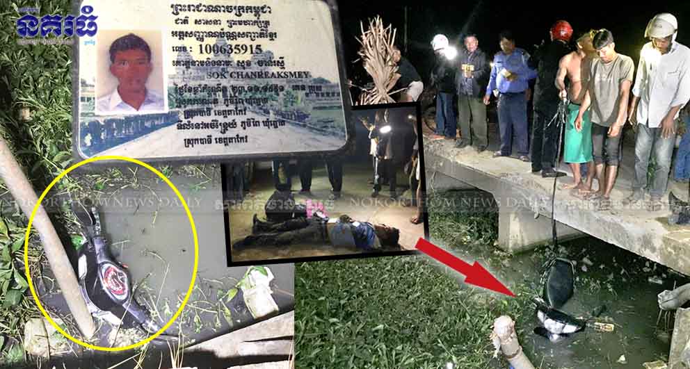 ភ្នំពេញ ៖ យុវជនជានិស្សិតពេទ្យសត្វម្នាក់ កំពុងជិះម៉ូតូតាមផ្លូវនៅពេលយប់ លុះត្រូវរថយន្តមួយគ្រឿងបើកភ្លើងហ្វាចាំងភ្នែកពេក មើលផ្លូវមិនឃើញ ក៏ធ្វើឱ្យរេចង្កូតធ្លាក់ពីលើស្ពានគ្មានបង្កាន់ដៃមួយកន្លែង បណ្តាលឱ្យឈ្លក់ទឹកស្លាប់យ៉ាងអាណោចអាធ័ម កាលពីវេលាម៉ោង៩យប់ ថ្ងៃទី១១ ខែធ្នូ ឆ្នាំ២០១៧ នៅតាមផ្លូវលេខ២១៧ ចំណុចស្ពានថ្មក្បែរស្ថានីយប្រេងឥន្ធនៈ LHR ស្ថិតក្នុងភូមិព្រែកជ្រៃ សង្កាត់ស្ពានថ្ម ខណ្ឌដង្កោ។