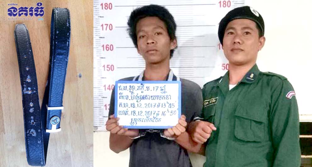 ជនរងគ្រោះមានឈ្មោះលី ផានុ ភេទប្រុស អាយុ១៧ឆ្នាំ ជនជាតិខ្មែរ មុខរបរសិស្ស លំនៅភូមិអំពិលទឹក ឃុំកំពង់ភ្នំ ស្រុកលើកដែក ខេត្តកណ្តាល។ ជនសង្ស័យមានឈ្មោះឡាយ ភក្តី ភេទប្រុស អាយុ១៧ឆ្នាំ ជនជាតិខ្មែរមុខរបរលាងឡាន មានលំនៅភូមិស្ពានដែក ឃុំព្រែកទន្លាប់ ស្រុកលើកដែក ខេត្តកណ្តាល (ឃាត់ខ្លួន និងម្នាក់ទៀតមានឈ្មោះធា គីម ភេទប្រុស មុខរបរមិនពិត មានទីលំនៅដូចគ្នា (គេចខ្លួន)។ វត្ថុតាងចាប់យកមានខ្សែក្រវាត់ជ័រ ពណ៌ខ្មៅក្បាលដែក ម៉ាក Ben2 ចំនួន១។