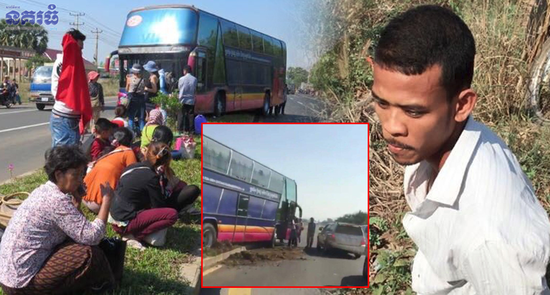 ខេត្តកំពង់ចាម ៖ ប្តីប្រពន្ធ២នាក់ កំពុងជិះលើរថយន្តក្រុងដែលកំពុងបើកបរលើដងផ្លូវ និងផ្ទុកអ្នកដំណើរពេញរថយន្ត ស្រាប់តែកើតមានជម្លោះនឹងគ្នា រហូតធ្វើឱ្យបុរសជាប្តីផ្ទុះកំហឹង បែរជាស្ទុះទៅទាញចង្កូតរថយន្តក្រុង ដែលកំពុងបើកបរ ធ្វើឱ្យរថយន្តរេចង្កូតឡើងលើខឿនសួនច្បារពុះចែកទ្រូងផ្លូវ ប៊ិះនឹងក្រឡាប់ផ្តាច់ជីវិតមនុស្សទាំងអស់ដែលកំពុងរួមដំណើរលើរថយន្តក្រុង ធ្វើឱ្យអ្នកដំណើរភ័យស្លន់ស្លោ ភ្នែកនៅកញ្ចឹងក ខ្លះស្រែករកពុទ្ធោ!!! ខ្លះបន់គុណឪម៉ែឱ្យជួយ លុះក្រោយកើតហេតុ អ្នកដំណើរផ្ទុះកំហឹង ក៏ចាប់ជនបង្កទាញចង្កូតរថយន្តរូបនោះ ព្រួតគ្នា វាយម្នាក់មួយដៃមួយជើង បែកឈាមពេញមុខ។