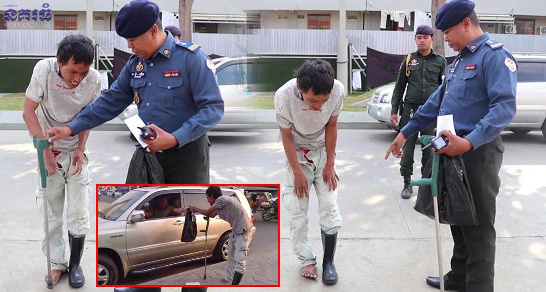 អ្នកសុំទានដែលប្រើល្បិចជាជនពិការ ប្រកបរបរសុំទានខាងលើនេះ ត្រូវបានលោកឧត្តមសេនីយ៍ឯក រ័ត្ន ស៊្រាង មេបញ្ជាការរងកងរាជ អាវុធហត្ថលើផ្ទៃប្រទេស និងជាមេបញ្ជាការកងរាជអាវុធហត្ថរាជធានីភ្នំពេញ បានប្រទះឃើញផ្ទាល់ភ្នែក កាលពីវេលាម៉ោង៥ល្ងាច ថ្ងៃទី០៨ ខែកុម្ភៈ ឆ្នាំ២០១៨ នៅត្រង់ចំណុចសួនច្បារក្បែរស្តុបផ្សារដើមគ ស្ថិតក្នុងសង្កាត់ផ្សារដើមគ ខណ្ឌទួលគោក គ្រាដែលលោកឆ្លៀតពេលទំនេរចេញពីកន្លែងធ្វើការទៅហាត់ប្រាណ ហើយភ្លាមនោះ លោកក៏បានបញ្ជាឱ្យកម្លាំងអាវុធហត្ថចុះត្រួតពិនិត្យ និងបញ្ជូនខ្លួនទៅមន្ទីរសង្គមកិច្ចរាជធានីភ្នំពេញ។