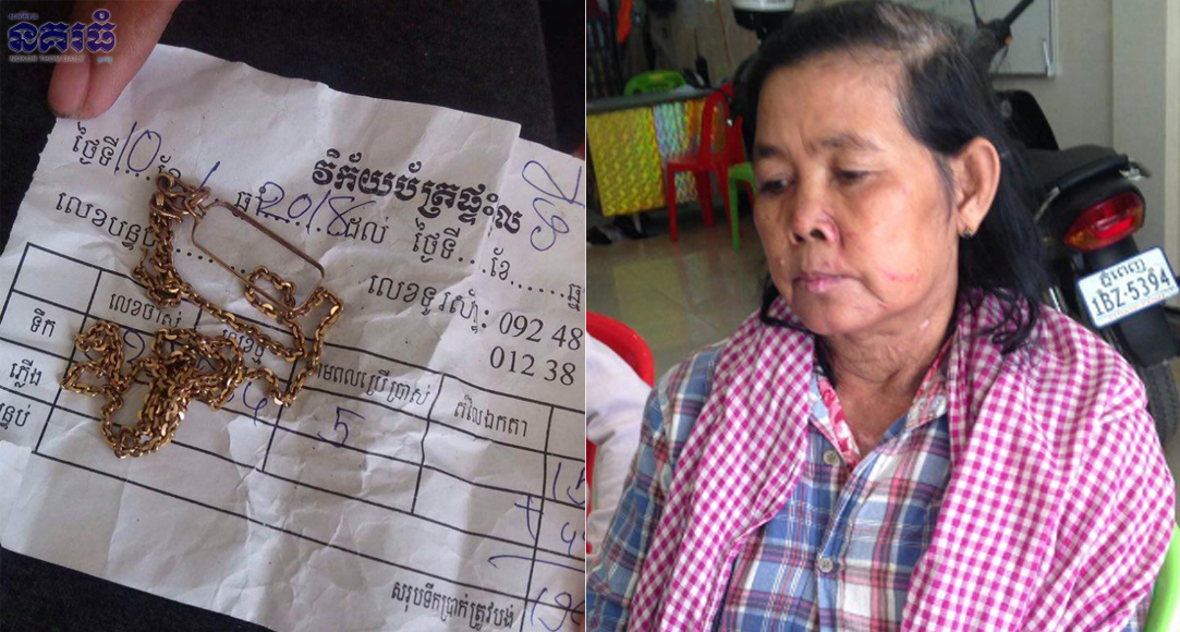ស្ត្រីរងគ្រោះ បន្តថា លុះមកដល់វេលាម៉ោង៣និង៣០នាទីរសៀល ថ្ងៃទី០៩ ខែកុម្ភៈ ឆ្នាំ២០១៨ ស្រាប់តែមានស្ត្រីឈ្មោះរ៉ុម ជាប្រធានផ្នែកអនាម័យនៅក្នុងបរិវេណបុរីពិភពថ្មី មិនដឹងមូលហេតុអ្វី ស្រាប់តែស្ទុះមកវាយរូបគាត់ដែលជាមនុស្សចាស់ជាច្រើនដៃ ដោយបន្សល់ទុកនូវស្លាកស្នាមនៅលើផ្ទៃមុខជាច្រើនកន្លែង ហើយបានទាញខ្សែករបស់គាត់រហូតដាច់ជ្រុះបាត់បណ្តោង ទើបឈប់ រួចហើយស្ត្រីបង្ករូបនោះក៏ដើរចេញទៅបាត់តែម្តង។