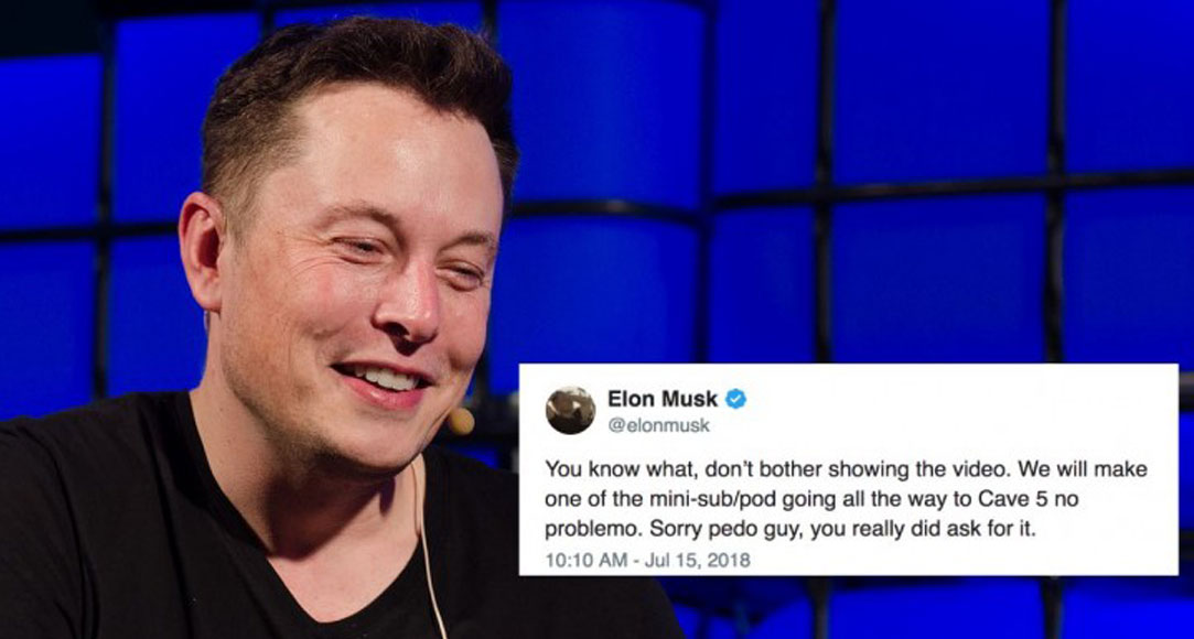 លោក Elon Musk នាយកប្រតិបត្តិក្រុមហ៊ុនអេឡិចត្រូនិក ដ៏ល្បីល្បាញមួយនៅអាមេរិក បានចេញមុខសុំទោសជាសាធារណៈ ចំពោះលោក Vernon Unsworth ជនជាតិអង់គ្លេស ដែលបានរកឃើញក្រុមកីឡាករបាល់ទាត់ក្មេងៗជាប់ក្នុងរូងភ្នំមុនគេ ថាជាមនុស្សចូលចិត្តរួមភេទជាមួយនឹងក្មេងៗ។ ការចេញលិខិតសុំទោសនេះ ក្រោយពីវីរបុរសអង់គ្លេស បានគំរាមចាត់វិធានការផ្លូវច្បាប់ ប្រឆាំងទៅនឹងរូបលោក ដែលបានបង្ហោះសារនៅលើគេហទំព័រ Twitter ថា លោក Vernon Unsworth គឺជាមនុស្សចូលចិត្តរួមភេទជាមួយនឹងក្មេងៗ ហើយសារនេះត្រូវបានមានអ្នកចូលមើលជាង២០លាននាក់។
