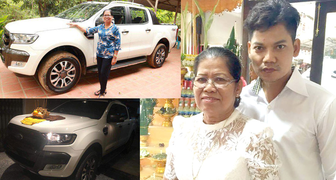 ម្តាយព្រាប សុវត្ថិ ដែលឈរថតជាមួយរថយន្តថ្មី ទើបបកស្រោមនោះ ថ្លែងថា “អរគុណណាស់កូនសម្លាញ់ សម្រាប់កាដូដ៏ភ្ញាក់ផ្អើលមួយនេះ”។