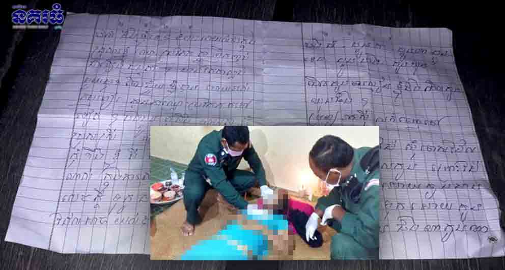 ខេត្តស្វាយរៀង ៖ ស្ត្រីម្នាក់ព្រោះតែមានវិបត្តិក្នុងគ្រួសារ ត្រូវប្តីប្រើអំពើហិង្សាវាយដំ ធ្វើទុក្ខបុកម្នេញគ្រប់សព្វបែបយ៉ាង រហូតដល់ទ្រាំទ្រលែងបាន ក៏ដាច់ចិត្តចងកសម្លាប់ខ្លួន ដោយបន្សល់ទុកលិខិតបណ្តាំចំនួន៤សន្លឹក ផ្តាំលាកូន ព្រមទាំងពឹងពាក់ឱ្យសាច់ញាតិ បងប្អូនជួយមើល ថែទាំកូនជំនួសខ្លួនផង។