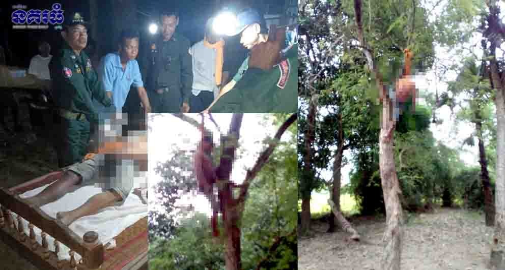 ខេត្តស្វាយរៀង ៖ ក្មេងៗមួយក្រុមកំពុងដើរឃ្វាលក្របីក្បែរវាលស្រែសុខៗ ក៏ស្រាប់តែចោលភ្នែកមើលទៅលើចុងឈើមួយដើម ប្រទះឃើញសាកសពចងកនៅលើដើមអំពិល ក៏នាំគ្នាផ្អើលឆោឡោ រត់បះសក់ដោយនឹកស្មានថា ខ្មោចលង តាមពិតជាសាកសពមនុស្សចងកសម្លាប់ខ្លួនសោះ។